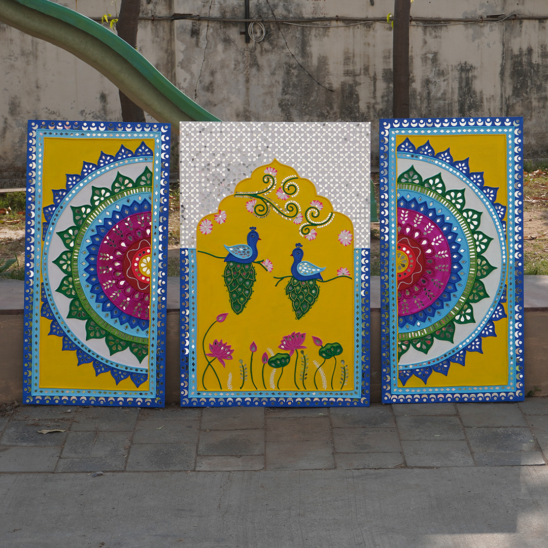 Elevate your home décor with this exquisite 3-piece handpainted wall art set, showcasing the timeless beauty of Indian artistry. Each canvas is meticulously crafted with vibrant colors, intricate mandala patterns, and a captivating peacock motif, symbolizing grace, beauty, and prosperity.